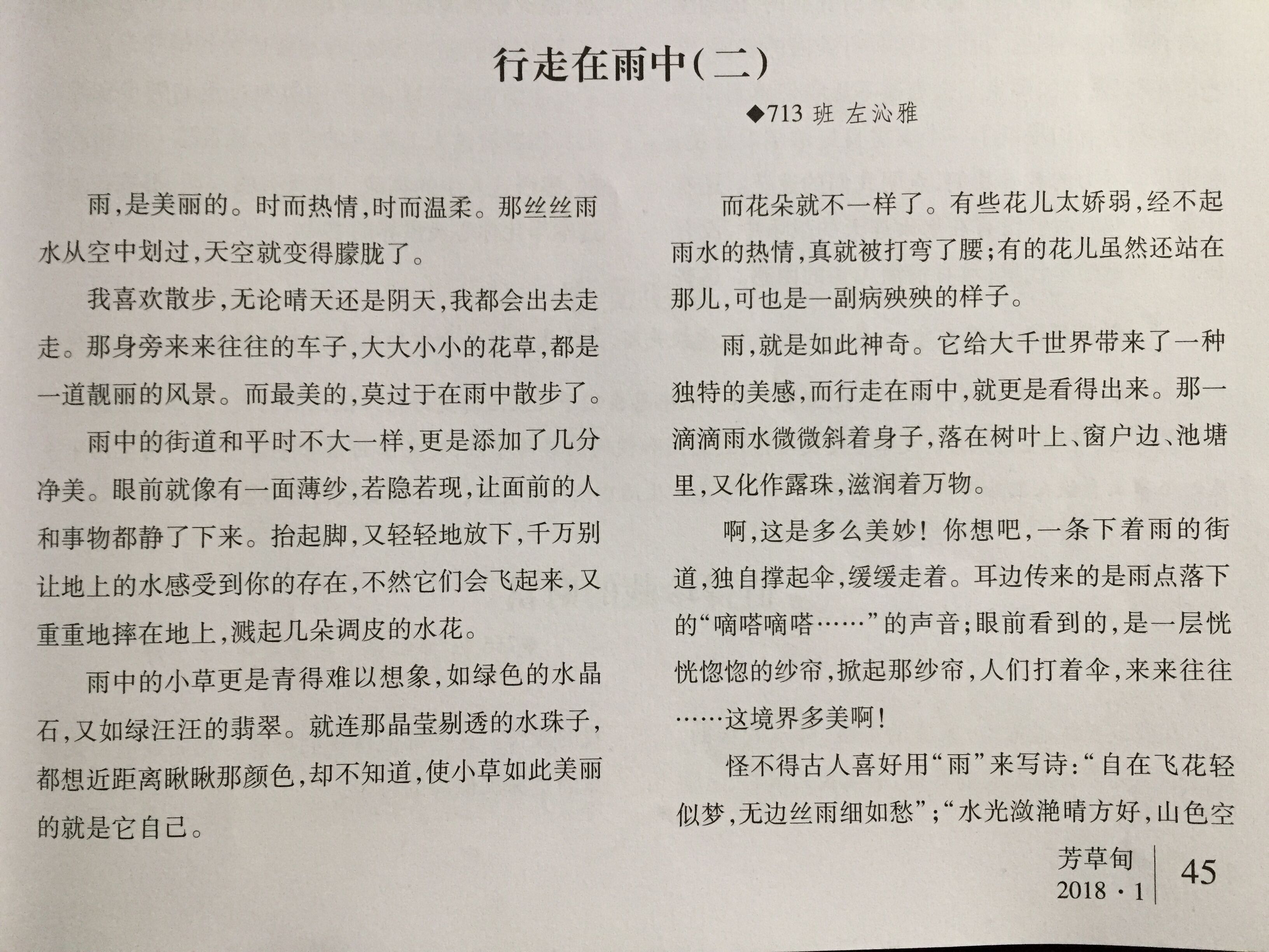 雨,就是如此神奇。它给大千世界带来了一种独特的美感,而行走在雨中,就更是看的出来。那一滴滴雨水微微斜着身子,落在树叶上、窗户边、池塘里,又化作露珠,滋润着万物。