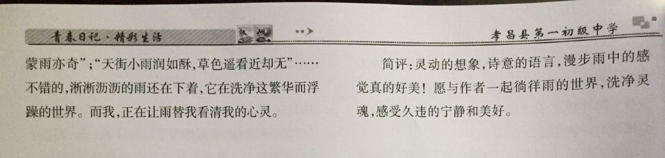 怪不得古人喜好用“雨”来写诗:“自在飞花轻似梦,无边丝雨细如愁。”“水光潋滟晴方好,山色空蒙雨亦奇。”“天街小雨润如酥,草色遥看近却无。”不错的。淅淅沥沥的雨还在下着,它在洗净这繁华而浮躁的世界。而我,正在让雨替我看清我的心灵。